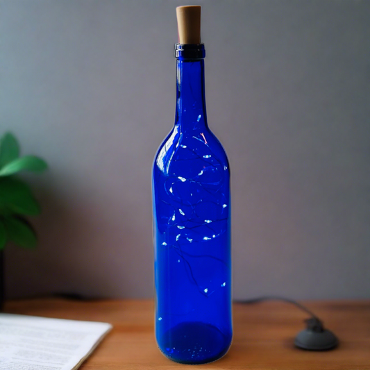 Blue Wine Bottle with Warm White Fairy String Lights, 750ml, Battery Operated Lights - DIY Projects and Décor