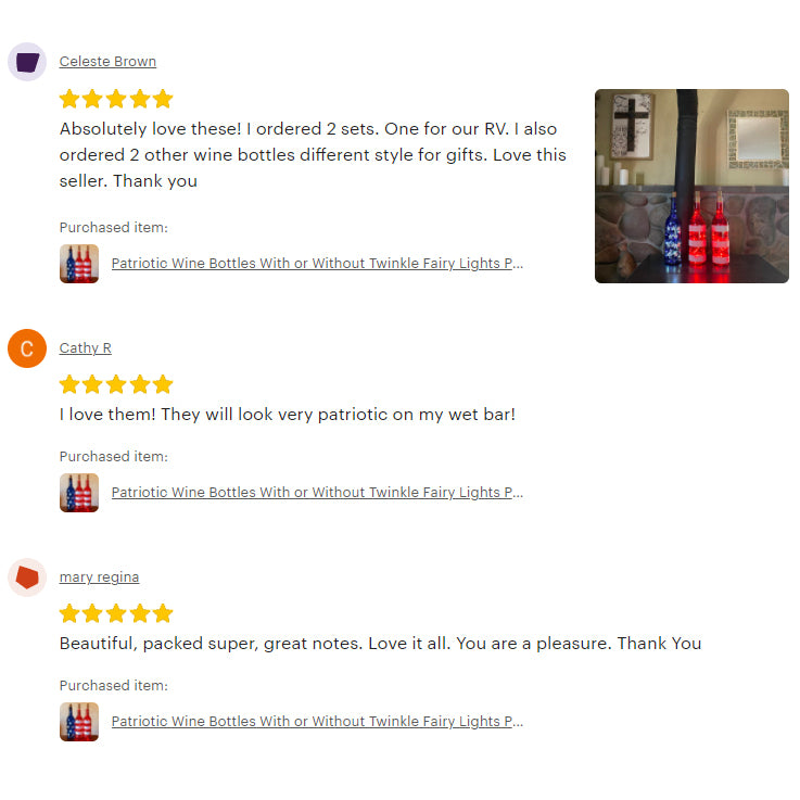 Elevate your ambiance with our enchanting Patriotic Wine Bottles with Fairy String Lights adorned with battery-operated lights inside. Crafted with care, each bottle features delicate string lights that cast a warm and inviting glow, perfect for adding a touch of romance to any setting. Whether used as a centerpiece for intimate dinners or as a charming accent in your home decor, this illuminated wine bottle creates a mesmerizing atmosphere that captivates all who behold it. Battery-powered for convenience, with the on/off switch is conveniently located in the cork, it's an effortless way to infuse your space with elegance and charm. Bring the magic of warm lights to your home with our stunning illuminated wine bottle.